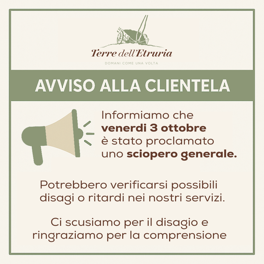 Avviso alla clientela Informiamo che venerdi 3 ottobre è stato proclamato uno sciopero generale. Potrebbero verificarsi possibili disagi o ritardi nei nostri servizi. Torna indietro